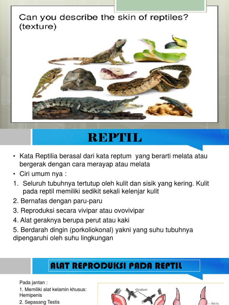 Reptili adalah kelompok hewan berdarah dingin berkaki empat dan vertebrata yang ciri utamanya yaitu memiliki kulit yang tertutup sisik keratin. Reptilia merupakan kelompok hewan darat pertama yang sepanjang hidupnya bernafas dengan peru-paru. Reptilia merupakan kelompok hewan darat pertama yang sepanjang hidupnya bernafas dengan paru-paru.