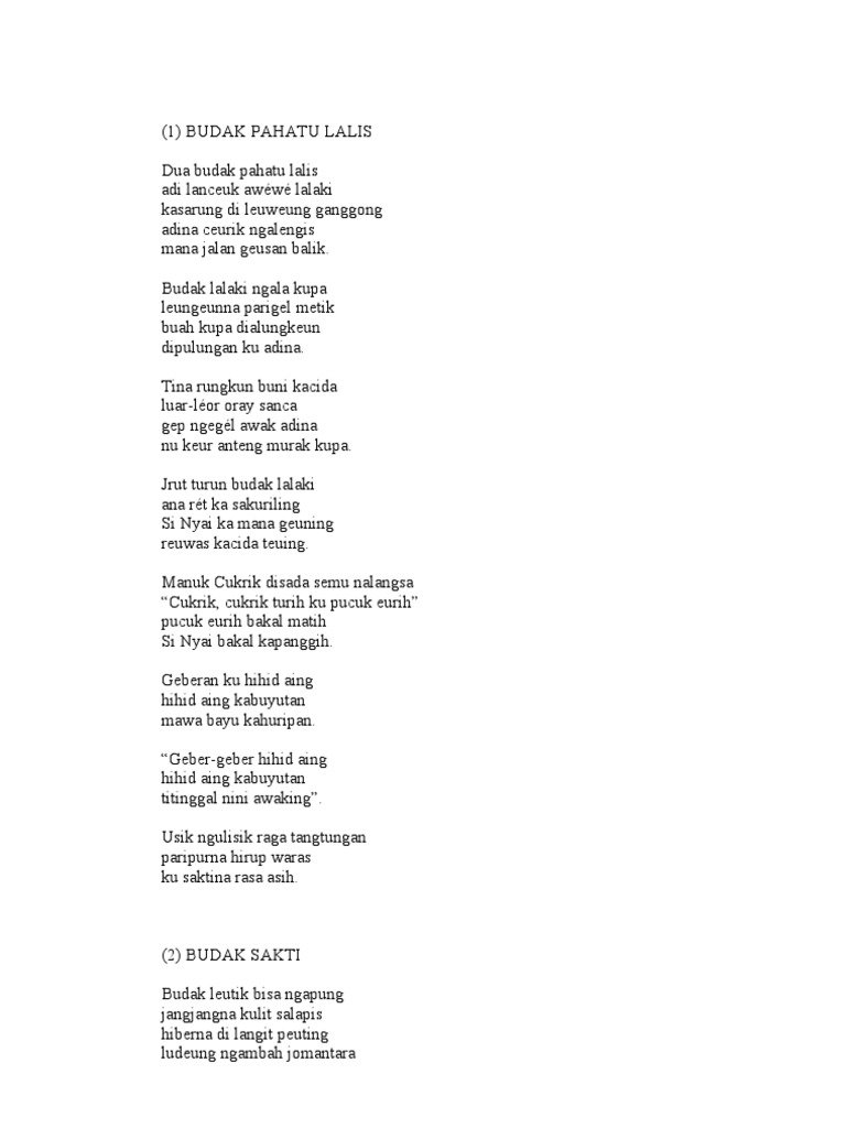 Puisi BSunda 1 BUDAK PAHATU LALIS Dua budak pahatu lalis adi lanceuk aww lalaki kasarung di leuweung ganggong adina ceurik ngalengis mana jalan geusan balik. Adi lanceuk aww lalaki. KUMPULAN SAJAK SUNDA PIKEUN BARUDAK.
